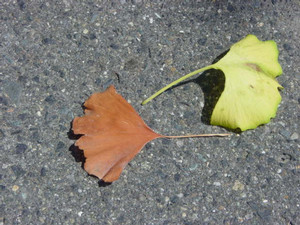 公孫樹は陽射しが弱まると、緑の葉の色素が抜け、黄色くなる。枯葉になると葉に取り残された糖分が赤茶色になる。